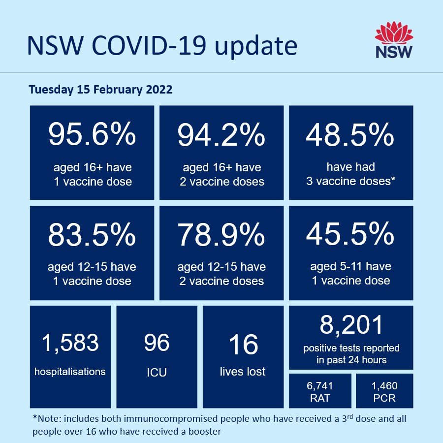 Nsw Health On Twitter Nsw Covid 19 Update Tuesday 15 February 2022 In The 24 Hour Reporting Period To 4pm Yesterday 95 6 Of People Aged 16 Have Had One Dose Of A